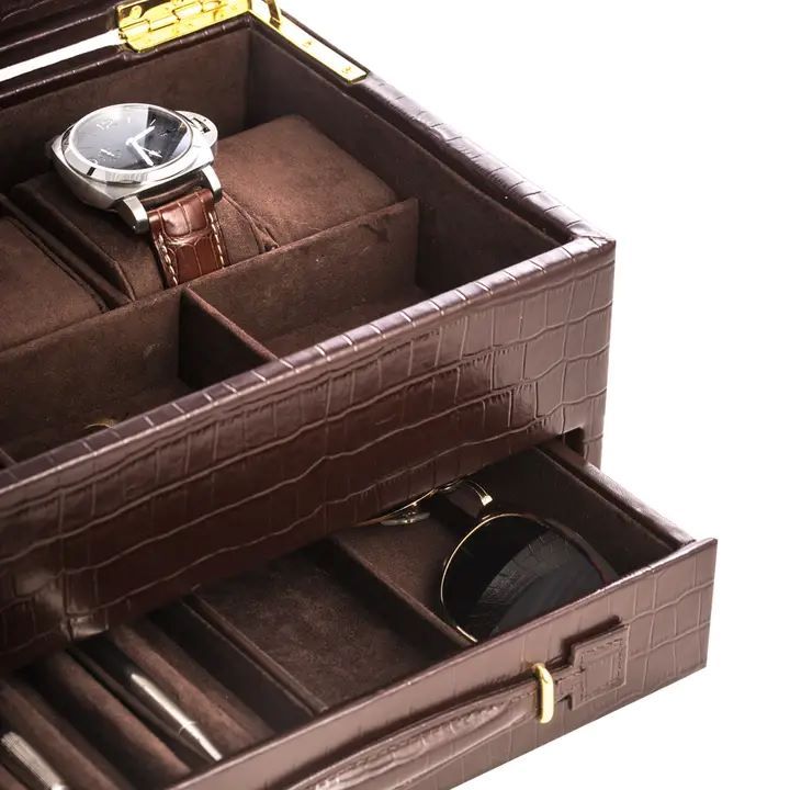 Watch Case - Brown Croco Grained Leather with Drawer