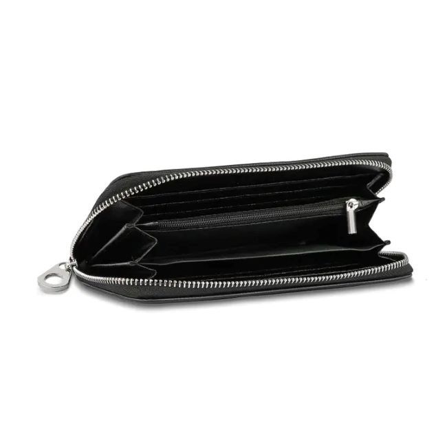 Interior zip divider pocket, multiple currency slots and card slots.