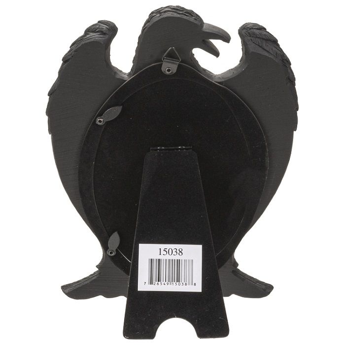 Black Raven 4 X 6 Picture Frame. Gothic style Cold cast resin. Fits 4 x 6 photo. Frame measures: Hang on wall or free standing. 6.5" X 0.79" X 8.86