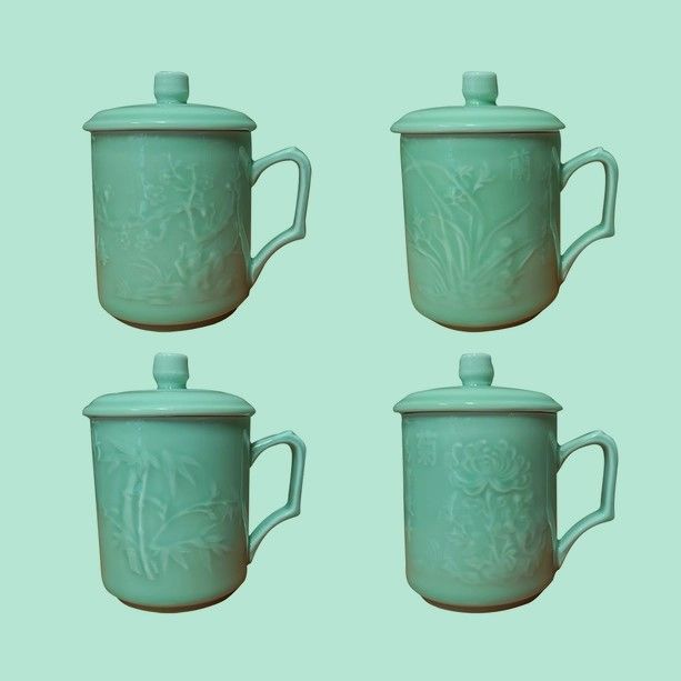 Celadon Ceramic Mugs with Lids Four Seasons Design 4pc Set