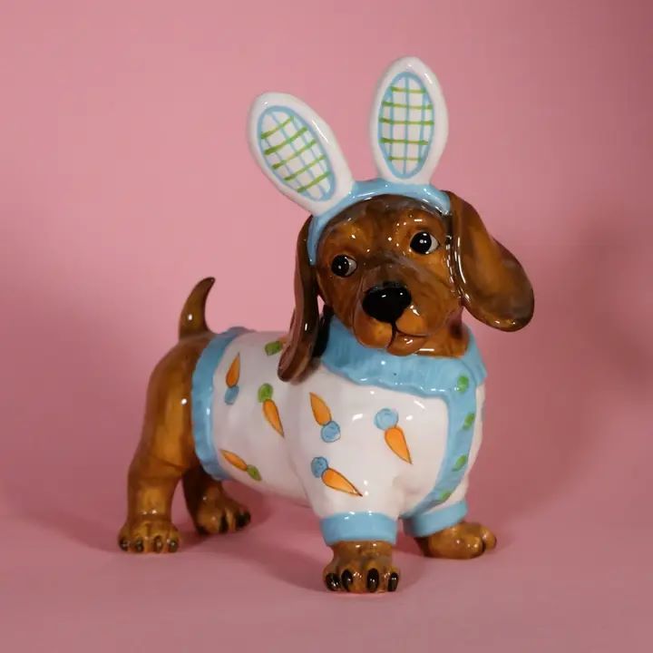 This delightful ceramic dachshund is dressed to impress in the cutest bunny-inspired outfit, complete with tall rabbit ears and a cozy white sweater sprinkled with cheerful carrots . With its sweet expression, floppy ears, and glossy hand-painted finish, this little pup perfectly blends playful whimsy with irresistible charm.