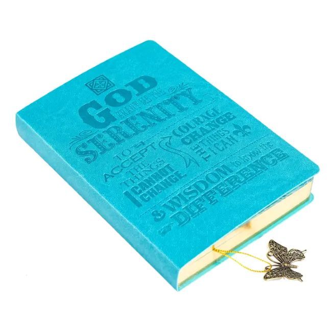 Faux Leather Journals feature cream colored pages with gold gilding and include a journal wrap and bookmark. They have 160 lined pages with scripture or inspirational verse on every spread and measure 7.5" high x 5.375" wide. Features the Serenity Prayer on the front.