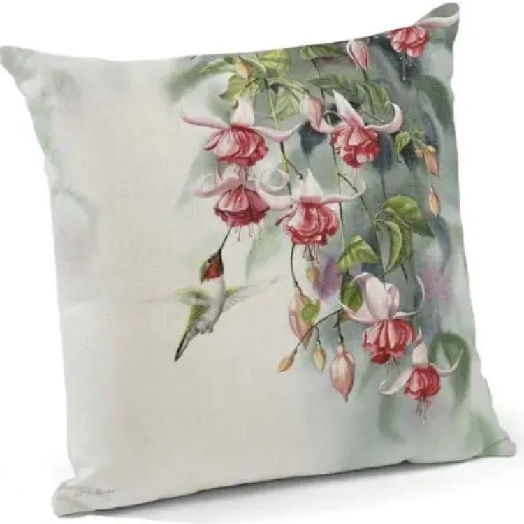 Add a touch of color and flare to your home decor with this vibrant image of Garden Gem Ruby-Throated Hummingbirds on an 18" square pillow. Perfect for the bird lover or someone who enjoys nature-themed decor. Images are slightly different on front and back of pillow to change things up every once in a while.