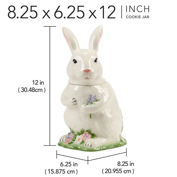 Its charming design features a white bunny with a soft, glossy finish, detailed with delicate floral accents and a hint of greenery at its base. The bunny's upright posture and the tender expression on its face make it an adorable piece that's not just a container but a display-worthy work of art. Imagine this cookie jar sitting on your counter, filled with your favorite treats, bringing a touch of whimsy and joy to your home. It's a functional piece that also serves as a conversation starter, perfect for those who love unique and decorative items in their home.