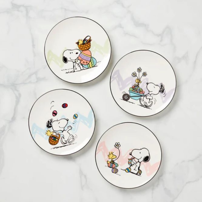 Snoopy and his bff Woodstock are EGGcited for Easter! Each porcelain plate in this adorable set of four illustrates the too-cute twosome smiling for spring with baskets, blooms, and even a wheelbarrow of Easter eggs. Add these to the table for a fresh, fun take on bunny day brunch. 8in. dia.