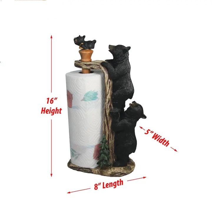 This paper towel holder is designed to sit on a kitchen countertop so you can keep your paper towels conveniently within reach. The paper towel holder features two humorous black bears standing on their hind legs with a cub. The Bear paper towel holder will bring some flair into any kitchen.