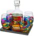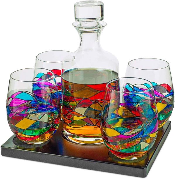 Renaissance Romantic Stain-glassed Windows Whiskey & Wine Decanter and Glasses - These hand painted glasses were individually made by artisan glassblowers and uniquely crafted. Each individual set comes with A decanter wood base holder and 4 hand-painted glasses designed for you or a loved one.