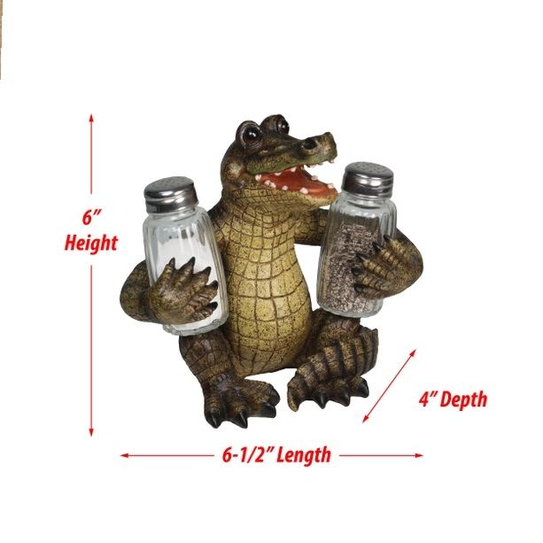 This alligator salt and pepper shaker set will be a welcome addition to your dining room table. The shakers are made of clear glass so you'll never mistake salt for pepper when you season your food.