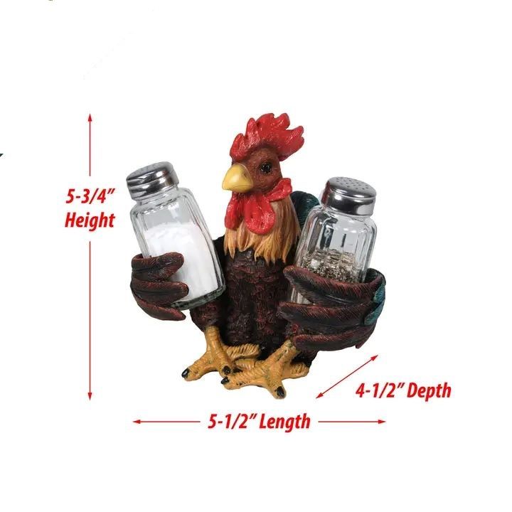 The glass salt and pepper shakers fit nicely around the wings of a rooster. The rooster is hand-painted poly resin and is highly detailed and colorful. The shakers are made of clear glass so you'll never mistake salt for pepper when you season your food.