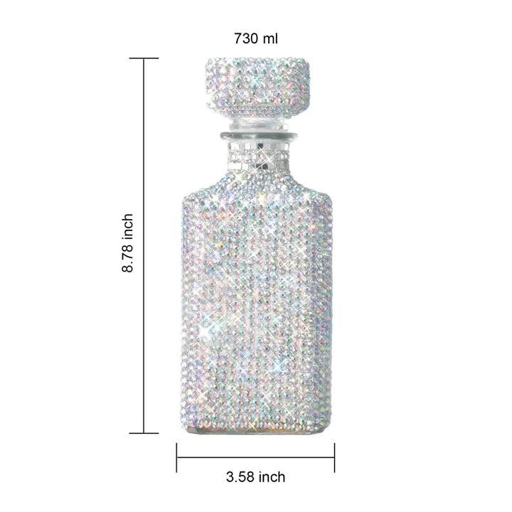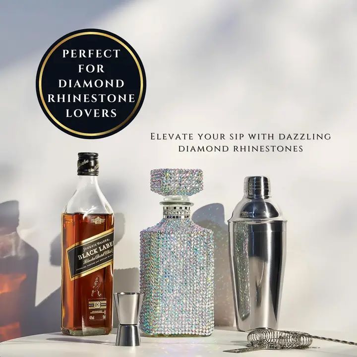 Introducing the Unique Diamond Rhinestone Decanter, a luxurious 730 mL carafe designed to elevate your spirits collection with a dazzling touch of glamour. Whether you're serving whiskey, tequila, wine, bourbon, or scotch, this stunning decanter is the perfect way to showcase your favorite beverages. Adorned with sparkling silver rhinestones that cover the entire surface, this decanter adds a sense of opulence to any home bar or dining room.